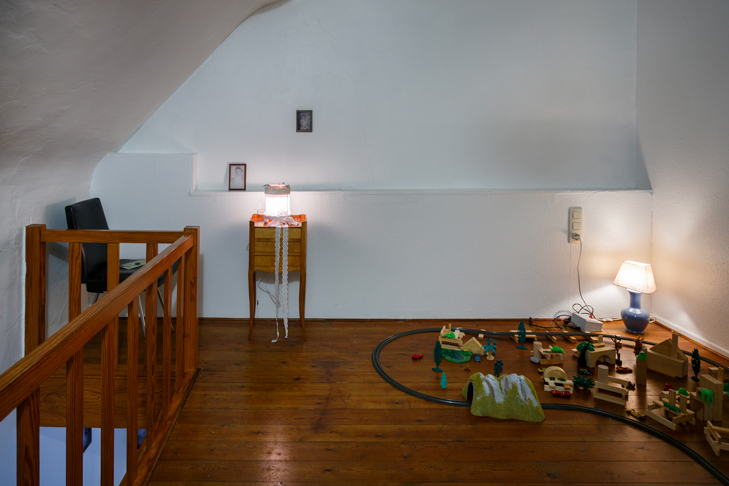 Paul Gérard, enfin, nous conduit dans une chambre d’enfant où le jeu et l’imaginaire deviennent refuges face aux images du monde. L’installation Rue Monrose, 62 : La Chambre, L’enfant, Le train associe film, son, dessin et circuit miniature pour plonger le·la visiteur·euse dans un espace à la fois familier et traversé de fantômes.