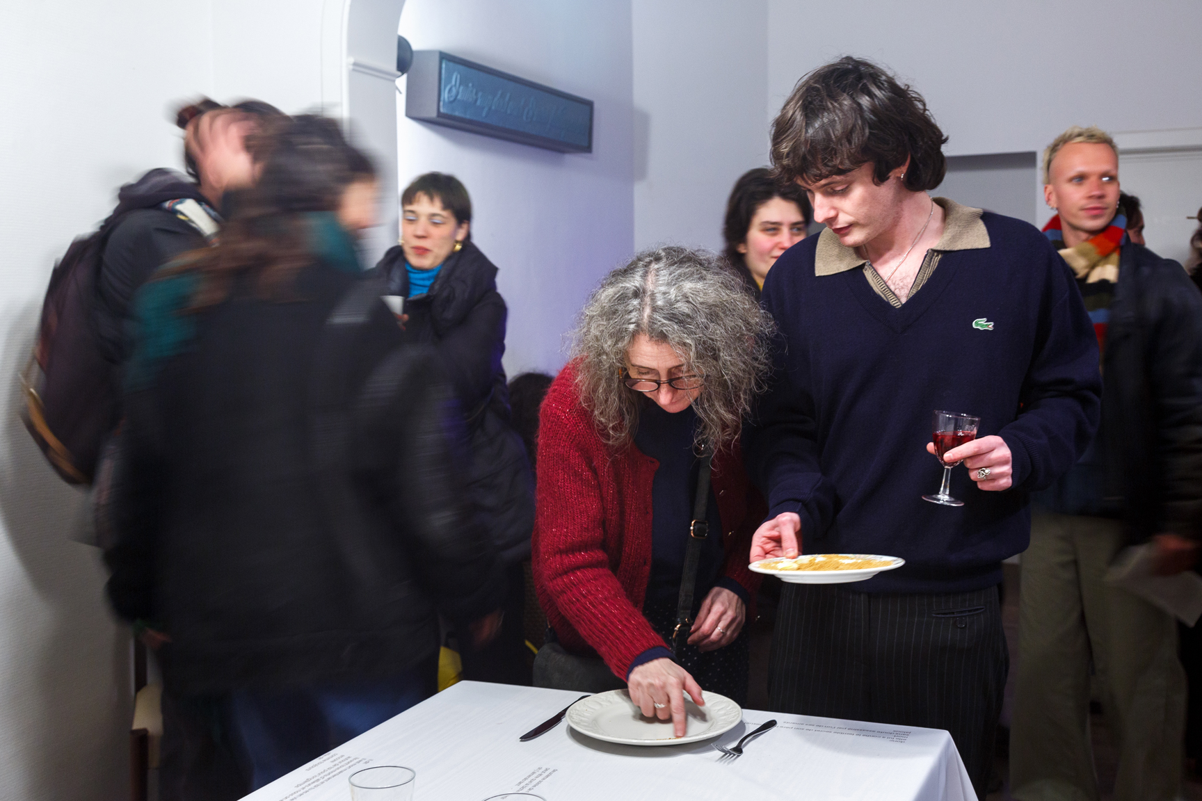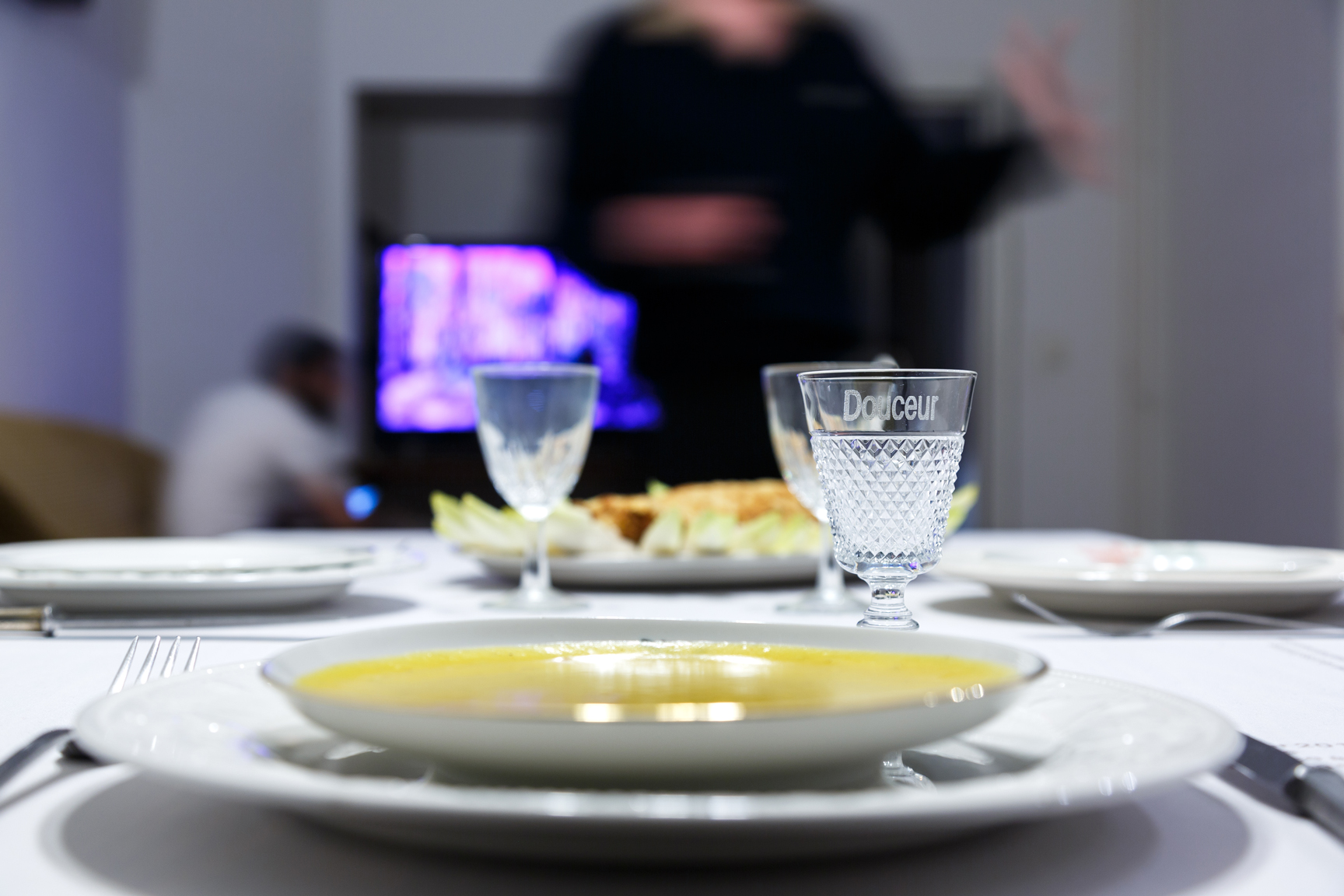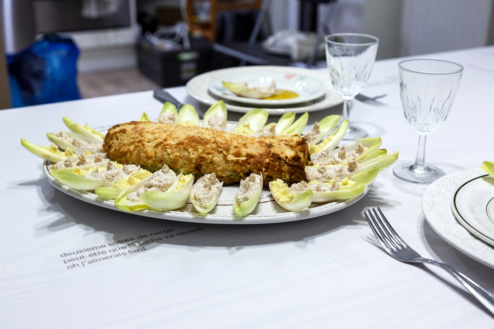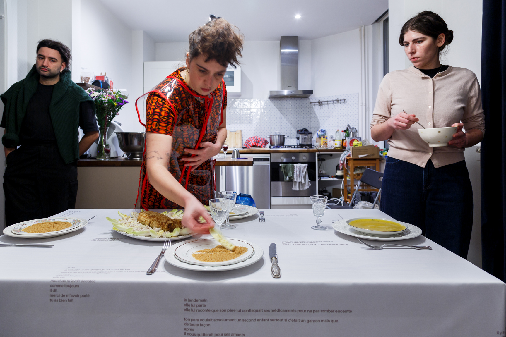 Le soir du vernissage, l’installation Les monstres n’existent pas était activée par une performance d’Adèle Pasquier, réinterprétant des plats familiaux traditionnels de la grand-mère paternelle de Paul Gérard : pêche au thon, baba au rhum et frites en zigzag.
