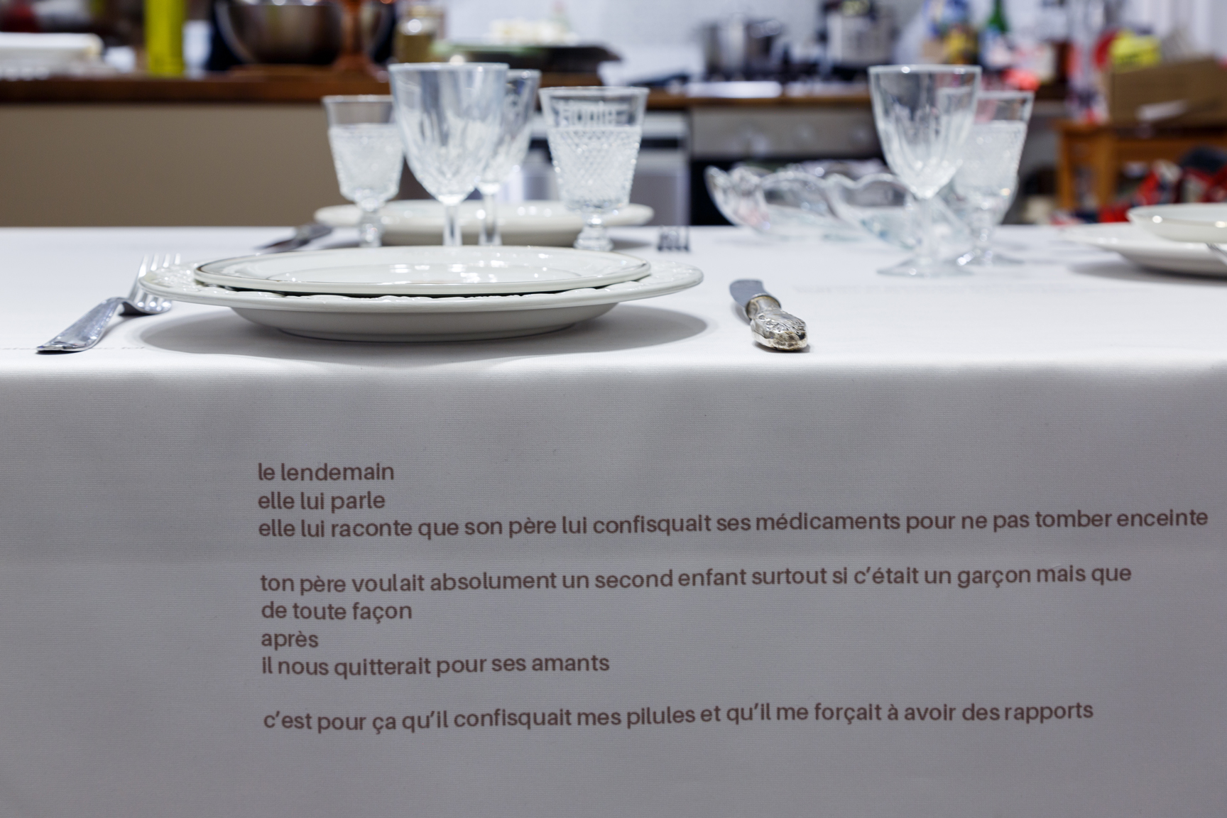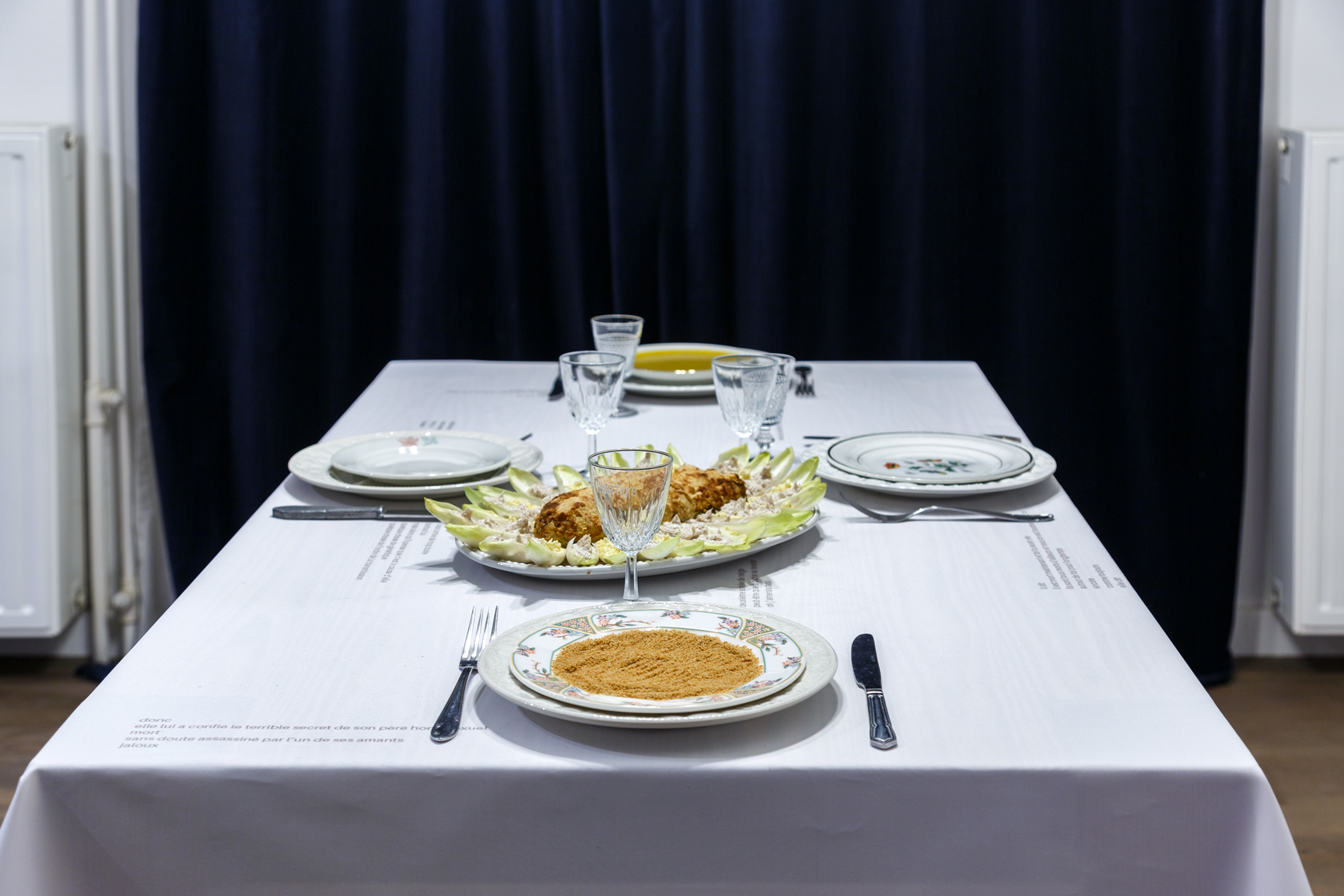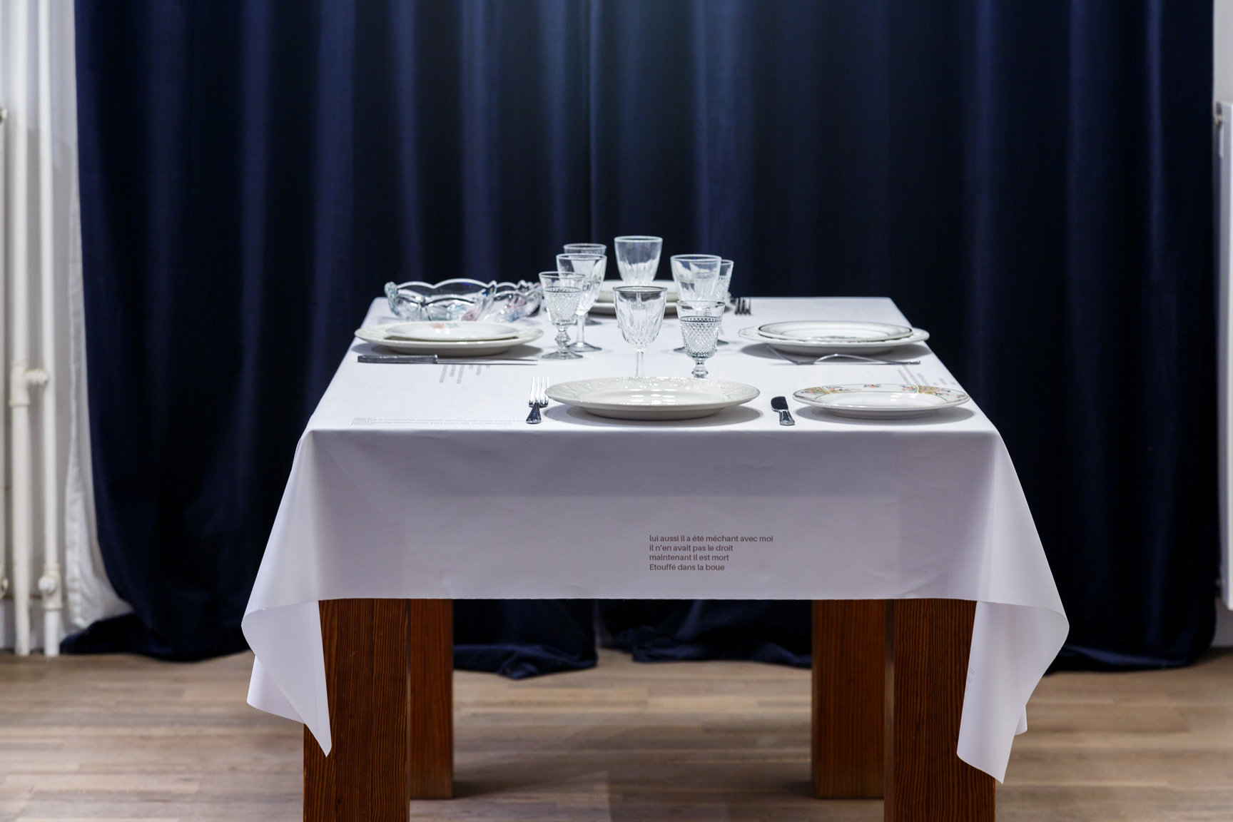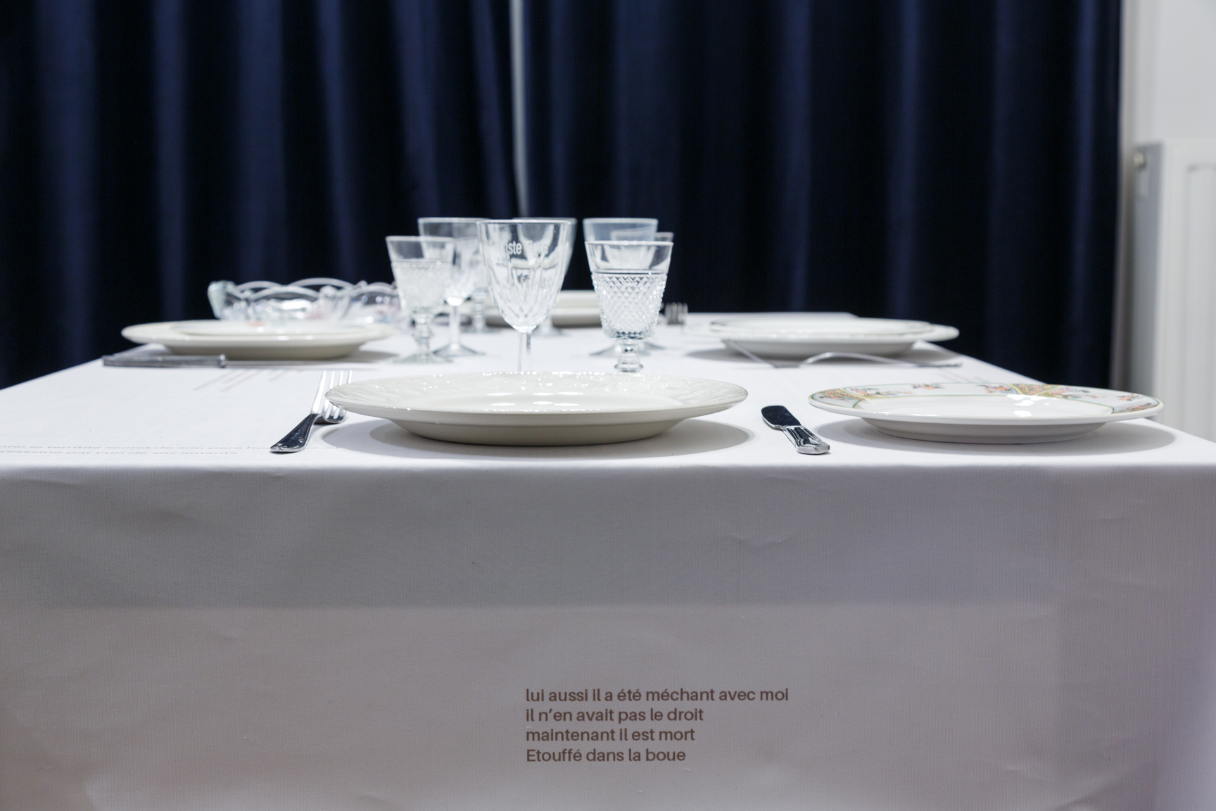 Depuis 2021, il s’intéresse à l’histoire de son grand-père, homosexuel inavoué et, selon sa grand-mère, assassiné par l’un de ses amants. Si, dans ses précédentes installations, il explorait les conditions de clandestinité de la communauté homosexuelle gay des années 1950 et 1960 à Bruxelles, il propose ici d’aborder un autre versant de cette histoire : la figure du « pédé bourreau ». Non pas seulement celle d’une victime d’un système d’exclusion, mais aussi celle d’un homme qui incarnait en société le modèle du bon père de famille, tout en devenant, une fois les rideaux tirés, une figure plus sombre pour les siens. Il ne s’agit pas d’établir un récit binaire, mais de tenter de comprendre les mécanismes à l’œuvre au sein du cercle familial. Sur la table, une nappe, des assiettes et des verres accueillent des fragments de récits : un dialogue entre le livre de son père, Les mots de ma mère, qui rassemble dix années de conversations avec sa mère, et les carnets de recherche de Paul, véritables matériaux d’enquête. Peu à peu se dévoile la figure du père : bourreau et victime tout à la fois. Paul s’attache ici à reconstituer le théâtre qui s’est joué.