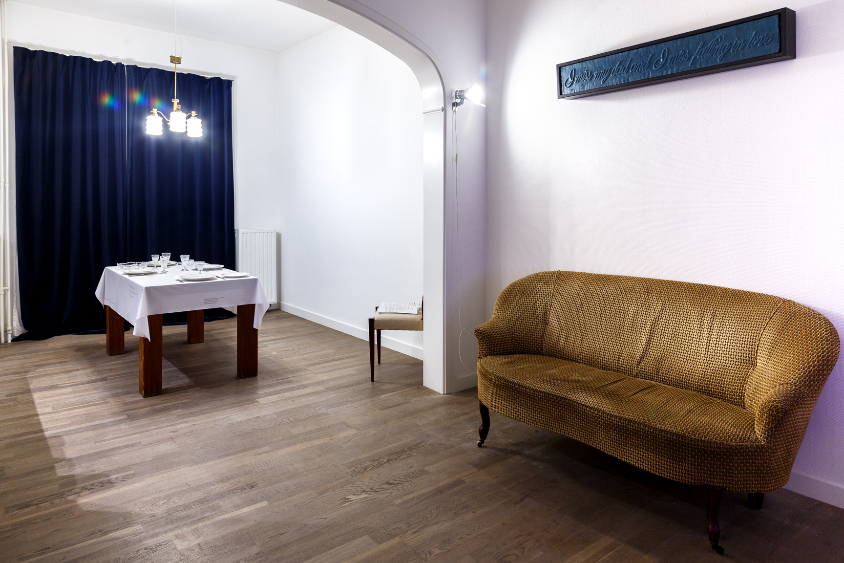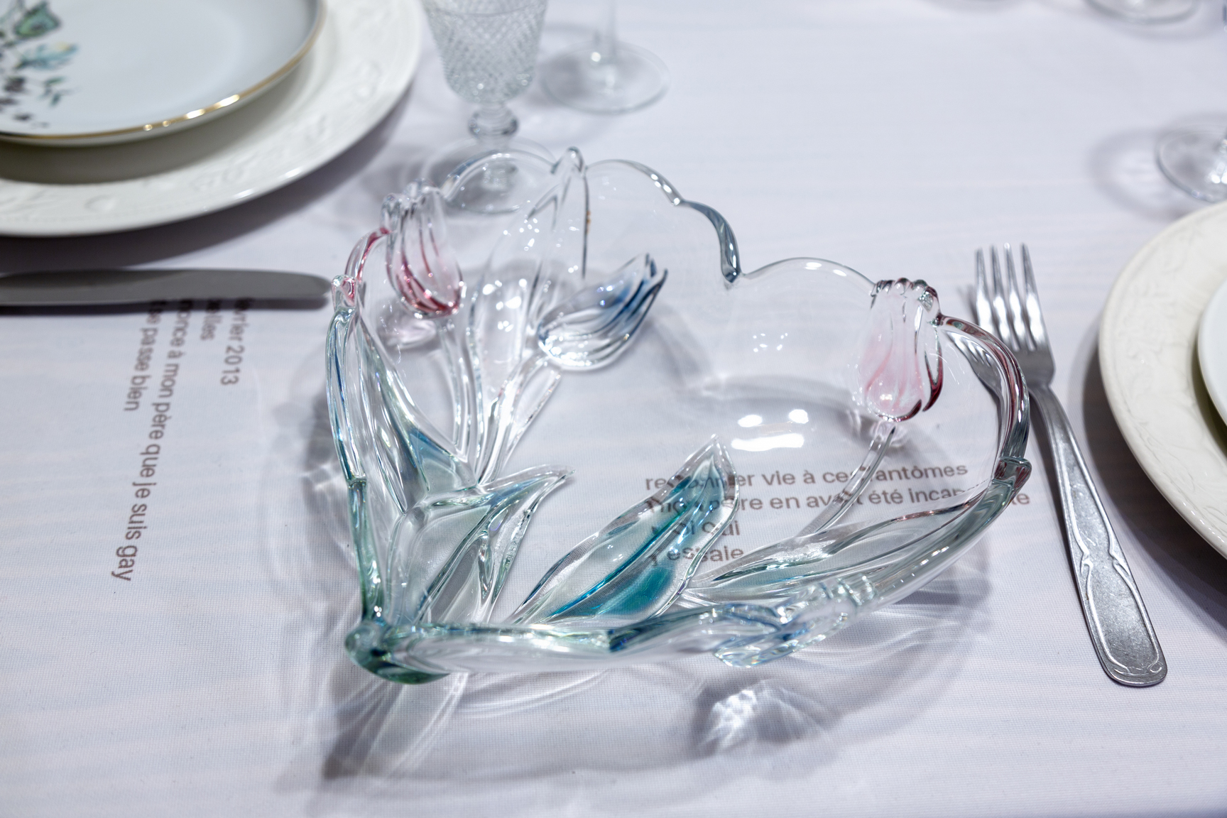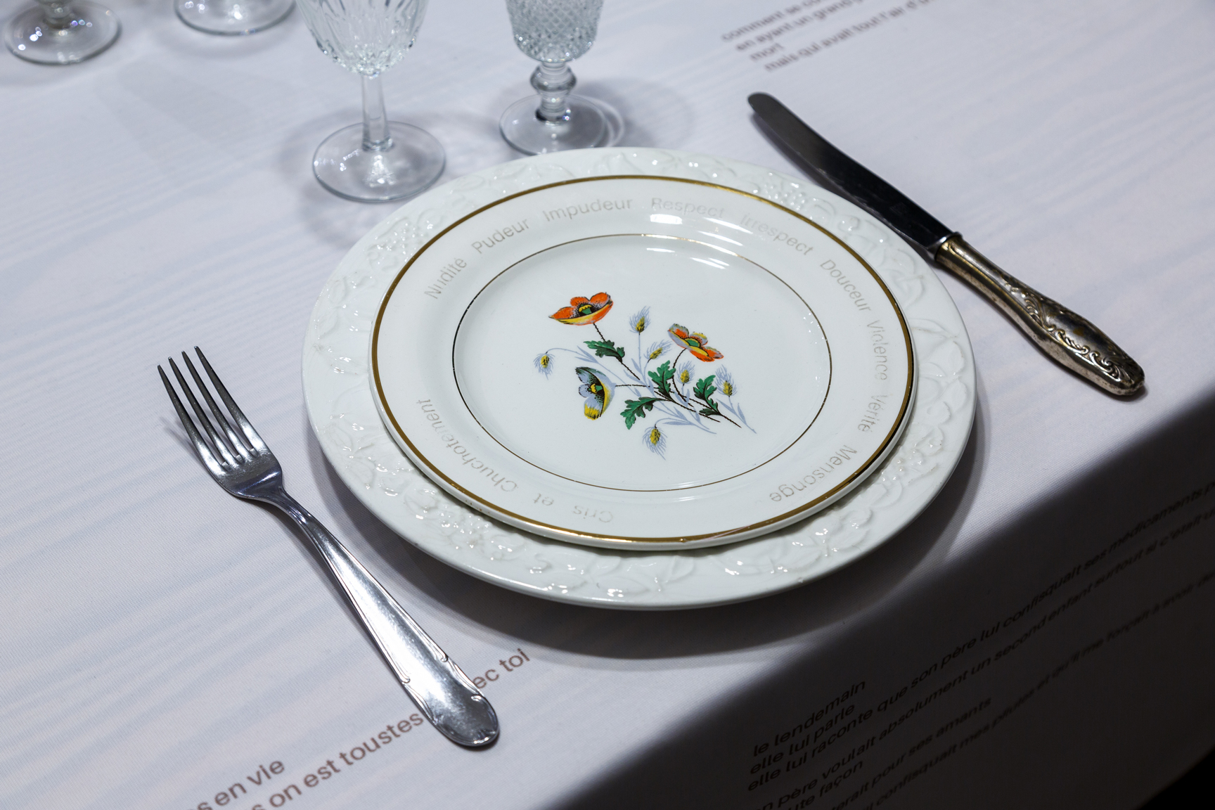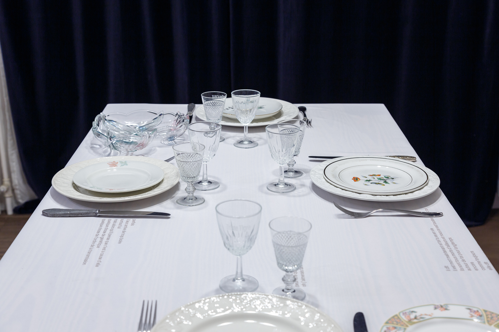 Depuis 2021, il s’intéresse à l’histoire de son grand-père, homosexuel inavoué et, selon sa grand-mère, assassiné par l’un de ses amants. Si, dans ses précédentes installations, il explorait les conditions de clandestinité de la communauté homosexuelle gay des années 1950 et 1960 à Bruxelles, il propose ici d’aborder un autre versant de cette histoire : la figure du « pédé bourreau ». Non pas seulement celle d’une victime d’un système d’exclusion, mais aussi celle d’un homme qui incarnait en société le modèle du bon père de famille, tout en devenant, une fois les rideaux tirés, une figure plus sombre pour les siens. Il ne s’agit pas d’établir un récit binaire, mais de tenter de comprendre les mécanismes à l’œuvre au sein du cercle familial. Sur la table, une nappe, des assiettes et des verres accueillent des fragments de récits : un dialogue entre le livre de son père, Les mots de ma mère, qui rassemble dix années de conversations avec sa mère, et les carnets de recherche de Paul, véritables matériaux d’enquête. Peu à peu se dévoile la figure du père : bourreau et victime tout à la fois. Paul s’attache ici à reconstituer le théâtre qui s’est joué.